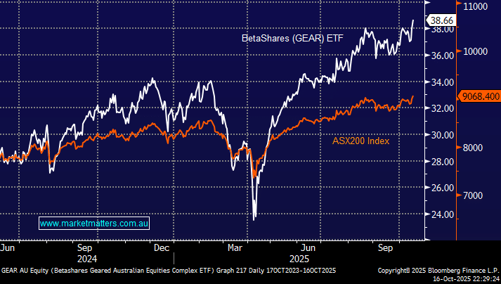 The GEAR ETF, traded on the ASX, is a bullish ETF for leveraged exposure to the ASX200; as would be expected, the five largest holdings are now CBA, BHP, WBC, NAB and ANZ – no CSL at the moment. Fees are 0.8% pa, while dividends are paid twice a year in June and December. However, the GEAR’s real interest is its gearing, which is currently around 2.1x; hence, if the ASX 200 Index goes up 1% today, the ETF would be expected to go up approximately 2.1% before fees and expenses.