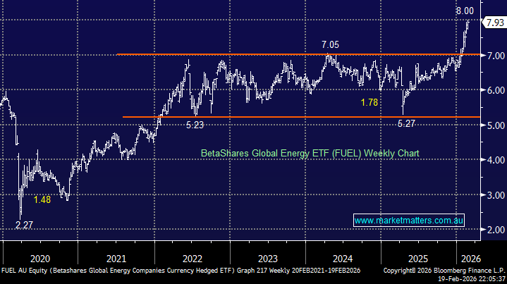 This ASX-traded  ETF provides Australian investors with exposure to a diversified portfolio of the world’s largest oil and gas companies by tracking a global energy sector index, with currency exposure hedged to the Australian dollar. The heavyweight local energy names are trading well below their highs, but it’s a very different story in the US, which is helping the FUEL ETF power to new highs this week: