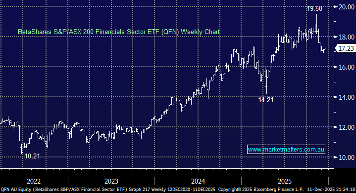 Bigger picture, the broad financials sector has enjoyed a strong advance since COVID, but with growth limited for the banks in the coming years, it’s hard to get overly excited about the QFN ETF; we believe better opportunities exist on the stock level within the financials sector. At MM, we are underweight the “Big Four banks”, with the stance likely to be maintained through 2026, hence the QFN isn’t likely to outperform next year.