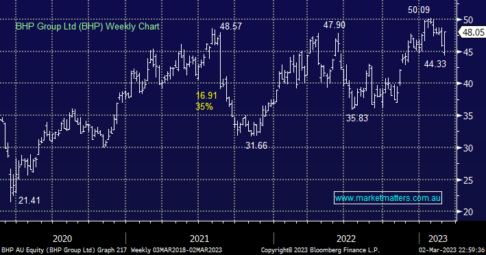 - Hence we may trim our BHP position slightly if it rallies into the $50-52 area next week otherwise we will stay as we are.