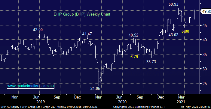 On a more positive note the “Big Australian” as it used to be called on the old trading floors rallied strongly to within striking distance of its all-time high yesterday and this morning it looks set to be within 1% of the milestone, a great performance considering the juicy dividends it’s paid along the way. We remain bullish BHP initially looking for another 10% upside where we will reassess the size of our position.