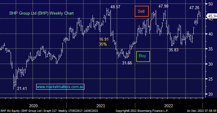 We recently reduced our position in BHP from 9% to 6% as the Big Australian knocked on the door of its resistance/sell area for the 4th time post-Covid. This is undoubtedly a great company but if commodity prices struggle under the weight of a global recession this stock is likely to follow in the downdraft.