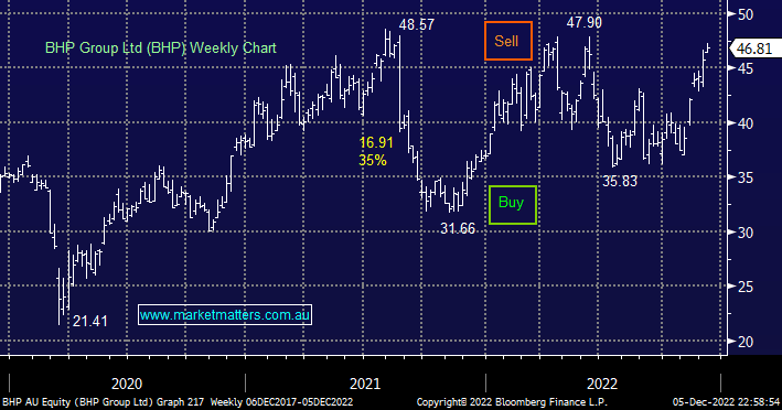 • We can see BHP testing the $48-50 area into Christmas where MM will consider reducing our exposure.