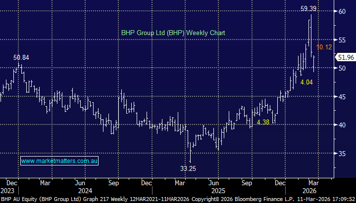 BHP has already corrected 17% from last week’s high, although it has paid a $1.03 fully franked dividend along the way. The firm iron price is supportive of this diversified miner, but it’s now more of a copper play, and the lasting impacts of the Iran War could weigh on the industrial metal in the coming weeks/months. A high oil price is a headwind for global growth, which is directly correlated to copper – we are considering increasing our copper exposure if we see another leg lower in the sector, but it’s unlikely we will add to our already sizeable position in the “Big Australian.” Alternative copper stocks to increase our exposure to the industrial metal include upweighting Sandfire (SFR) or buying Capstone Copper (CSC), or the gold/copper play Evolution Mining (EVN).