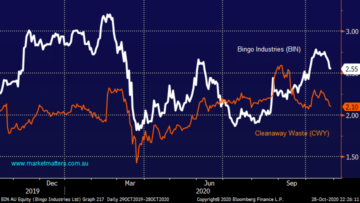 Over the last 3-months the performance differential in the waste management industry has been significant, BIN has rallied +25% while CWY has fallen almost 5%. The later has been slammed in the media on a number of fronts and while the issues are real they can be addressed to make the business a healthier corporate environment moving forward – whether the boss Vik Bansal can remain and thrive is still a bone of contention after a number of bullying claims.