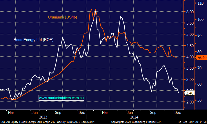 Investment bank UBS has lowered its outlook for uranium over the next two years by 9% to $US78 a pound in 2025 and 2026 and cut its share price target for Boss Energy (BOE) by 3% to $3.40. The uranium space is in a bearish downtrend at present, and this change sent BOE down a whopping 8%, way more than the downgrade and below UBS’s target for the South Australian producer. Ironically, they still have a Buy on BOE, believing the stock is oversold.