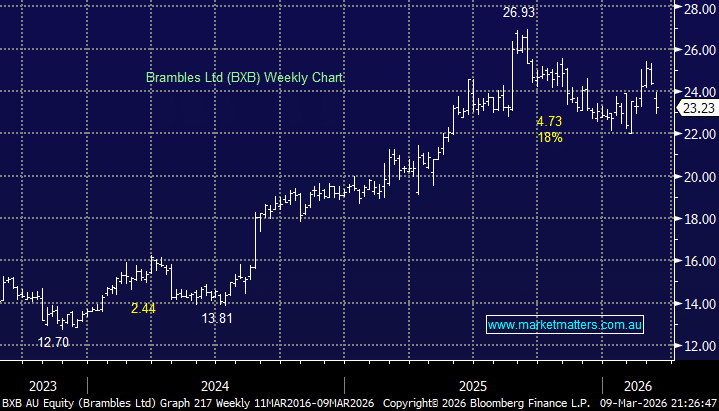 - We are looking for BXB to test below $22 in the coming weeks, or around 6% lower – BXB is in our Hitlist for the Active Growth Portfolio.