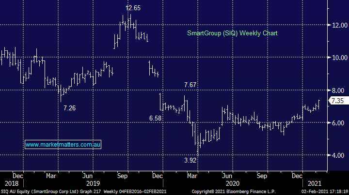 Smart Group (SIQ) was upgraded by Ords this morning with a BUY and $7.70 target price. We own the car leasing and salary packaging business SIQ in the Income Portfolio and it’s starting to grind higher after a fairly lacklustre period. We had Matt Williams in the office from Airlie last year who highlighted this as one of his good value picks. It hasn’t done a lot but is now on the move. SIQ is relatively cheap (15x forward) and is tipped to yield 4.5% fully franked this year. I’ve actually bought it for my 94-year-old Grandma, rightly or wrongly.