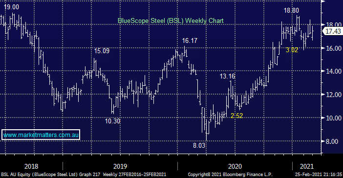 MM has been showing a few different Resources Stocks over recent weeks to illustrate our view that their surge higher had further to unfold, another which fits the picture is BlueScope Steel (BSL) where we are still targeting an assault on $20, or ~15% higher.