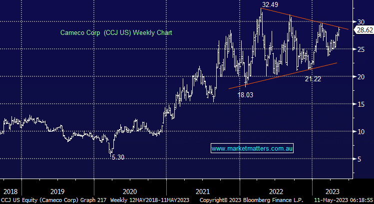 - Shares have consolidated for nearly two years, with an upside breakout looking likely. This provides a positive read-through for Australian uranium stocks.