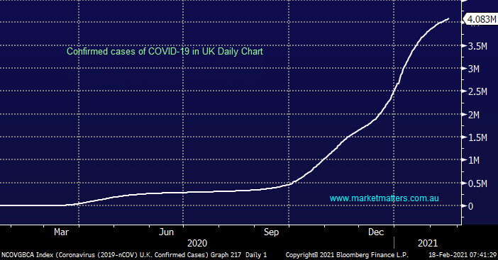 The COVID pandemic appears to be under control, the UK only registered 10,000 cases overnight compared to numerous days of well over 50,000 in January. Obviously there will be more inconvenient blips as we saw last week in Victoria but a return to some degree of normality should flow through in later 2021 / 22 although the exact form of that normality remains a fascinating point of discussion e.g. I cant imaging holidays in Europe / the US will be on the menu for at least 12-18 months’ time.