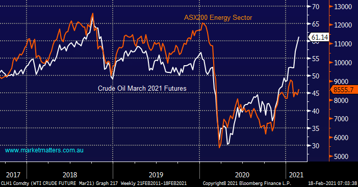 Markets regularly get ahead of themselves bringing to mind the old trading floor saying – “buy on rumour & sell the fact”. The chart below illustrates that the Australian Energy Sector roared higher in January before falling even as the oil price rallied, its actually failed to scale last months top even after the underlying commodity has rallied ~20%.