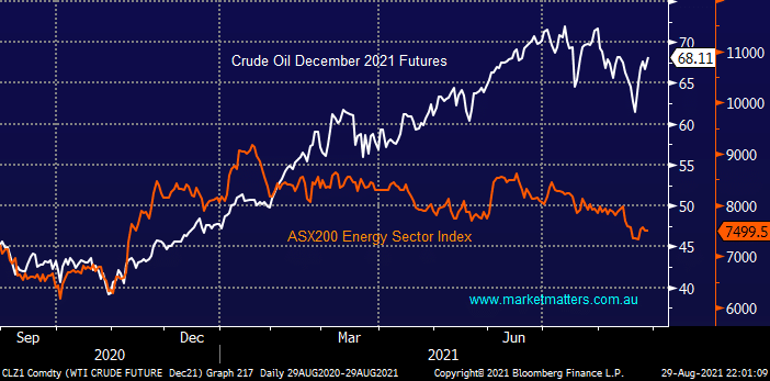 Last week crude oil rallied over +11% while the Australian Energy Sector fought hard to rally +0.8% illustrating a clear lack of belief towards the likes of Woodside (WPL) and Santos (STO). MM believes this is an example of pessimism having gone too far and the risk / reward favours accumulating the local names with Santos (STO) our preferred option.