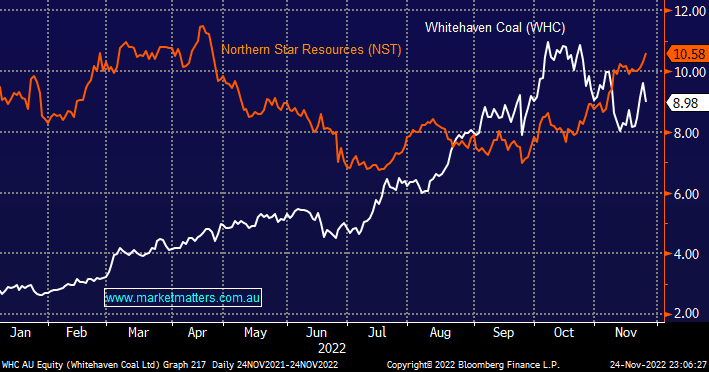 When we look at the correlation between Whitehaven (WHC) and Northern Star (NST), a prominent Australian gold producer, the picture has become far more mixed and MM is positioned accordingly e.g. the Flagship Growth Portfolio is holding 5% in Newcrest Mining (NCM) and 3% in Whitehaven Coal (WHC).