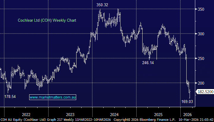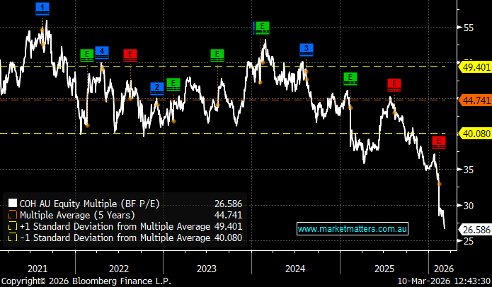 COH has more than halved from its 2024 high, and it now trades on its lowest valuation of the decade, despite revenue continuing to climb from $1.6bn in 2022 to a forecast $2.7bn by 2027. However, the market showed little patience during the recent reporting season, with the hearing device maker falling ~25% in February after a comparatively modest ~5% 1H profit miss. The miss was driven by weaker revenue, which came in ~4% below consensus, alongside margin pressure from a higher mix of lower-priced China VBP sales and the manufacturing transition to the Nexa platform. The recent news has been poor from COH, but it’s now priced for ongoing disappointment. The rhetoric from the company was, as would be expected, more positive moving forward.