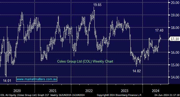 COL delivered a better 3Q trading update than WOW, but it was not enticing enough to take the supermarket giant onto our Hitlist. Its hard to envisage COL pushing much further above $17 as population growth and supermarket pricing become major political footballs into 2025’s election, i.e. a classic case of “if in doubt stay out”, especially after the stocks bounced ~15%. If pushed we prefer COL over WOW but it’s unlikely either will be in our portfolios in the next few months.