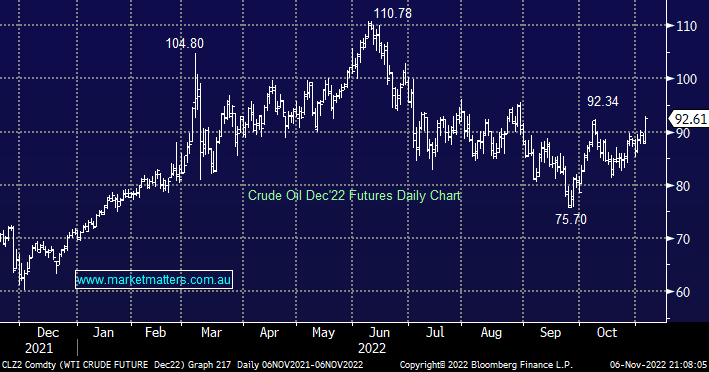 Last week and especially Friday was all about the surge in commodity prices courtesy of weakness in the $US and ongoing hopes that China might finally reopen the country – I heard an interesting theory from a well-respected doctor on the weekend while watching kids’ sport, he said the China Covid Policy stems from the fact that their vaccines simply don’t work, food for thought as we take our alternatives for granted. On Friday alone crude oil popped over +7% scaling levels not seen since the first week of September.