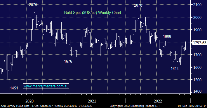 Gold and its associated stocks have soared higher over the last 5-weeks taking a bullish lead from the falling $US and global bond yields. The precious metal plunged 22% through 2022 as rising bond yields and an extremely strong $US removed the lustre from precious metals. This is yet another pocket of the market where bearish positioning is at an extreme and the “path of most pain” is on the upside, while $US1800 will offer some resistance as its been the average price over the last 2-years we can easily see a squeeze towards $US1900 through December.