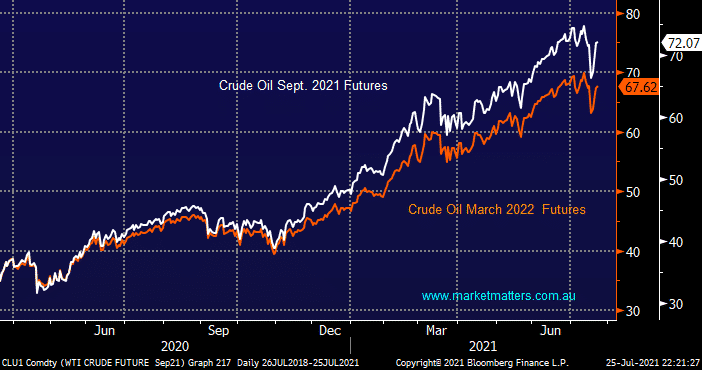 Interestingly, at the moment prominent commodities such as crude oil and iron ore are not believers in their short-term price squeezes with both trading in clear backwardation which undoubtedly contributes to why both respective sectors are struggling to rally to fresh highs with the ASX although the underperformance is far more exaggerated in the Energy Sector. At MM we feel this lack of confidence towards economic expansion in the months / years ahead is creating opportunities in a number of quality names which we believe are cheap compared to the market e.g. we bought Santos (STO) and OZ Minerals (OZL) last week.