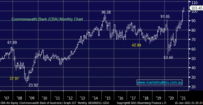 MM has called CBA over $100 since I can remember but the picture is getting more bullish both technically and fundamentally almost by the day. In similar fashion to the ASX I’m confident CBA will again correct $5-7 in 2021 but this might not unfold until we’ve breached $110 – investors are already looking forward to another attractive fully franked dividend in August along with the strong potential of additional capital management which explains one of the reasons why pullbacks remain shallow, well supported and short-lived.