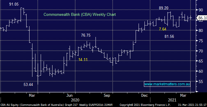 Australia’s largest bank is up +6% in 2021 but it has paid an attractive $1.50 fully franked dividend. With housing prices posting their largest monthly advance in 33-years bad debts from real estate have rapidly become a false call by the doomsday merchants through the COVID nightmare. The press continues to be littered with warnings from “experts” but MM still believes with official interest rates around zero and the banks free to lend the backdrop remains robust for both housing and the banks – just imagine where prices would be if we had active immigration! APRA restrictions might be looming on the horizon but with small outbreaks of COVID still around it would be a brave bureaucrat to apply the brakes this year.