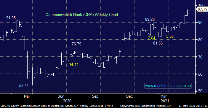 MM has been talking CBA at $100 for many months and here we are only 2% away, now the AFR has joined our catch cry the stock’s bound to have a pullback! We can envisage a period of consolidation between $95 and $100 over the coming weeks but we see no reason to reduce our position with the stock looking great both technically and fundamentally. We hold in both the Flagship Group & Active Income Portfolios.