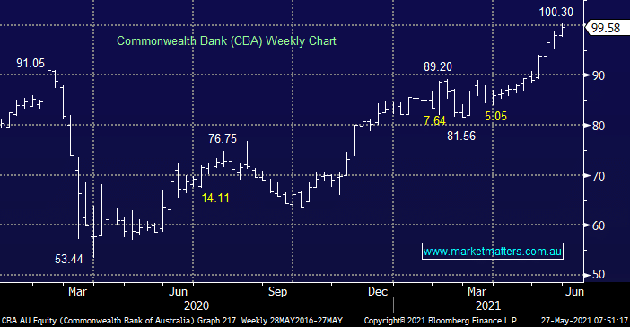 The banks are major beneficiaries of rising bond yields as it enables them to increase margins hence it should be no great surprise that yesterday CBA joined the illustrious $100 club, we’ve called it all year. Much of the easy money may be behind us with regards to the banks this year as they’ve revelled in the rising yield environment but MM has no interest in reducing our holdings however we would be a buyer of the next $5 pullback in CBA, or an equivalent sector name.