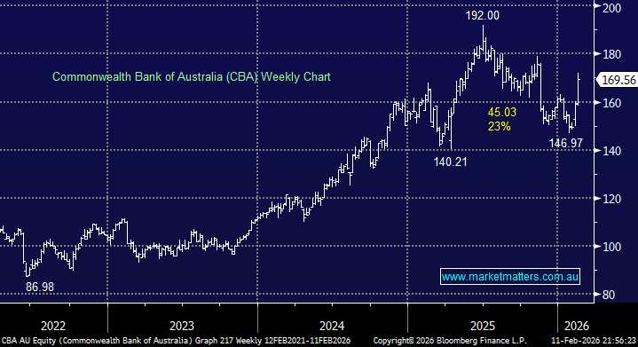 CBA is a world-class bank, but it’s often accompanied by the unattractive tag of being the world’s most expensive – but yesterday’s result demonstrated why. There was plenty to like in CBAs report from its giant $5.4bn profit as it cemented its dominant market position by holding its market share in the home loan market at over 25% while also increasing household deposits by 26.6%. Analysts may not be fans on valuation grounds, but the bank keeps delivering while keeping well ahead of the pack on the technology and AI front. A bonus is that the stock is also likely to enjoy a “safety” bid if we see any wobbles in the ASX this year, although its sub 3% fully franked yield is on the low side, particularly when CBA bonds paying ~5.5% – CBA will pay a $2.35 fully franked dividend next week.