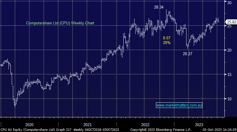 CPU +0.04%: the share registry and employee services company announced the sale of their US Mortgage Services business following a strategic review. US-based asset manager Rithm is expected to pay $US720m for the book which is in line with their tangible asset value and with market expectations for the sale. While Computershare expects the deal to complete in around 6 months’ time barring any regulatory issues, they have stuck to guidance for FY24. They decided to sell the unit to focus more on the core business, noting the US Mortgage Services arm has come in below margin and return on capital targets, been more capital intensive and faces greater regulatory risk. The CEO even went as far as saying it was “a bit too macro,” referring to the external factors it faces.
