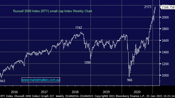The US Russell 2000 small cap index (RTY) has been leading the charge since late 2020, even on Friday when the Dow fell -180-points the RTY managed to eke out a respectable +1.3% gain. To put things in perspective this seldomly discussed index has outperformed the S&P500 in 2021 by a factor of 8x as optimism around Joe Biden and ongoing stimulus have fuelled this index which is often regarded as a close read of the real economy i.e. investors are bullish the US like ourselves through the year. The market believes President Biden will do everything in his power both from a financial and regulatory perspective to help smaller companies with his focus on stamping out COVID a great starting point – even if he fails the markets likely to run with this thematic for at least a year or so.