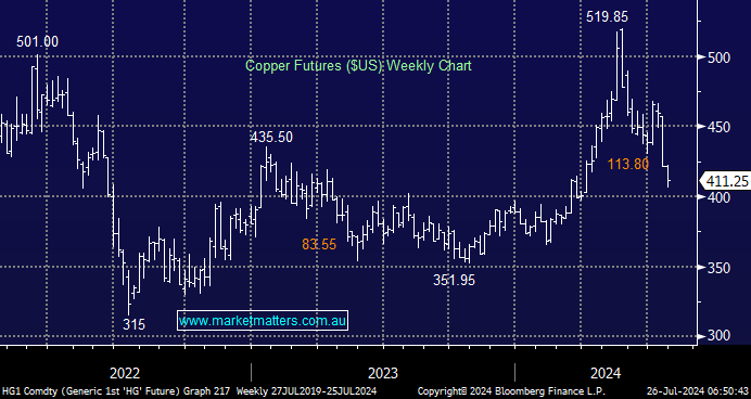 Industrial metal Copper (Cu) was the top commodity pick for most analysts at the start of 2024, including ours. Cu enjoyed phenomenal gains in the first half of 2024 before plunging over 20% as China’s economy slowed, leading to growing inventories, and EV sales continued to disappoint. We remain bullish despite current weakness, but the market has fallen further than MM expected. We should have guessed a top was close when BHP bid for Anglo American (AAL LN) in late June, i.e. corporate action often occurs near price extremes in the commodities space.