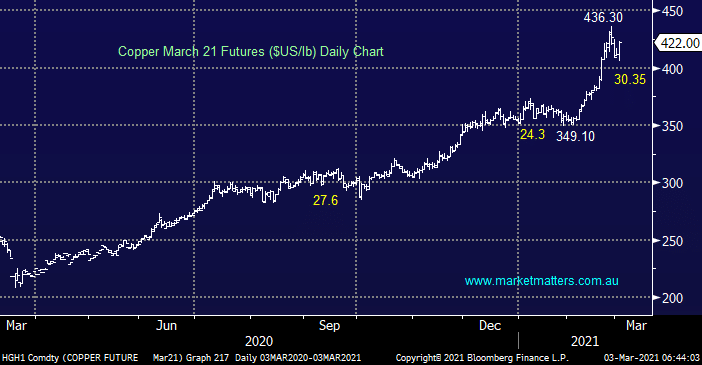 Copper caught my attention this morning after it bounced strongly following its recent 7% pullback, a move which clearly helped sentiment in the resources space e.g. BHP rallied over 4% in the US. Subscribers should also remember that ”surprises usually happen with the trend” and in the case of the resources they’ve been very bullish over the last 12-months, a test of ~$US450/lb in the coming weeks feels a strong possibility as the stimulus taps remain firmly turned on in the Western world.