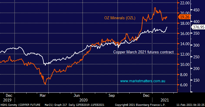 Base metals are a widely used leading indicator to the health of the global economy and copper has just made fresh recent highs as we targeted a few weeks ago – hopefully the producers like OZ Minerals (OZL) which we purchased on Tuesday will follow suit.
