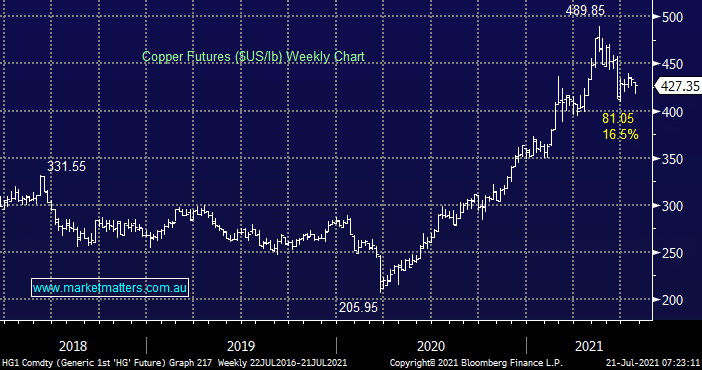 Similar to oil the very important industrial metal copper has corrected from its mid-May high, exactly the same time that investors started rotating away from resources towards tech. Our ideal target for copper is a test of the psychological $US4.00/lb area although we have to remain mindful that its rarely an “ideal world” and we may have to consider paying up for the likes of OZ Minerals (OZL) in the weeks ahead.