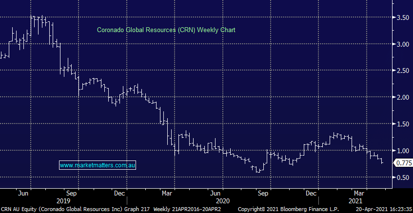 CRN -7.74%: The 1st quarter update came in below expectation for CRN today, a similar trend to Whitehaven Coal (WHC) recently, with coal sales falling ~10% largely blamed on the Lunar New Year. Production was slightly ahead on the Dec quarter but costs also crept higher, coming in at $62.2/t. The company noted foreign exchange & weather headwinds negatively impacted costs, though they maintained guidance here of between $57-59/t, which means they have a lot to do.  For Met Coal used in Steel making, which accounts for more than 80% of sales, prices were 12% better than the Dec quarter at $94.30/t highlighting the improving coal market – a trend we expect to continue.
