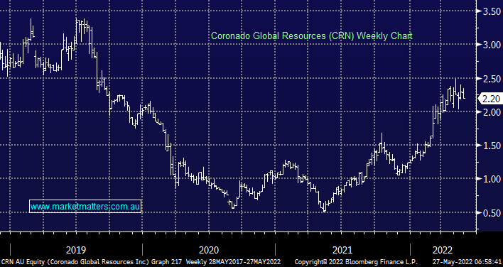 Brisbane based coal miner CRN now has a market cap of $3.7bn after rallying 5-fold from its 2021 low, similar to NHC & WHC, again we like the business / stock but wouldn’t be cashing at current levels.