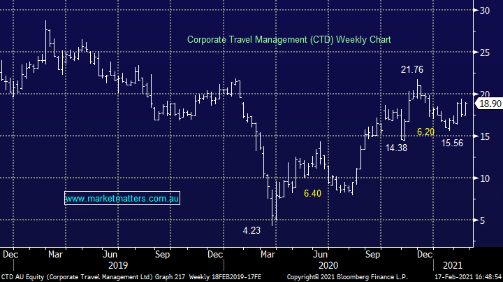 Corporate Travel (CTD) +4.94%: This is a stock we’re keen on as discussed in recent notes and today they delivered an okay update for the 1H21 given the challenging conditions, however there is a solid improvement in exit-run rate for the period and importantly, they’ve won a lot of new customers over the past 6 months, plus of course invested internationally at a low point. We like companies that have the fortitude to turn turmoil into opportunity and that’s what CTD did during the pandemic. These guys will come out the other side a lot bigger and stronger business and while these half yearly numbers were nothing to get excited about, things are shaping up nicely for FY21.