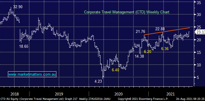 MM has been eyeing off CTD over through 2021 but in hindsight we’ve been too pedantic on price, not uncommon with an investment that ends up being correct as a number of players are looking at the same idea hence supporting the price into pullbacks. Similar to QAN the stocks trading well below its pre-pandemic low but in this case we especially like their proactive moves to grow over the last 2-years through acquisition which has set the business up to be the 4th largest global travel management business.