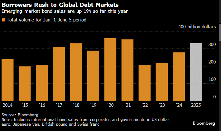 Strong demand from yield-hungry investors is driving a surge in developing-world bond sales as borrowers race to secure financing ahead of any further uncertainty across global markets. Since the beginning of the year, emerging-market governments and companies have sold $331 billion in debt denominated in hard currencies like the dollar and euro, according to data compiled by Bloomberg. That is the fastest pace in four years and already surpasses the total in the first half of 2024. Investors have fueled a broad rally in international assets amid questions about the long-standing dominance of US markets, which have sent the value of the dollar down.