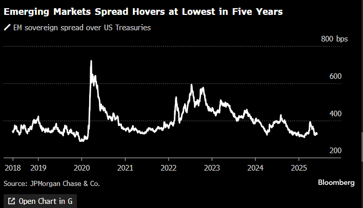 The higher yield investors demand to hold dollar bonds from emerging countries over US Treasuries has fallen and is now hovering close to its lowest level since 2020, according to a JPMorgan index.