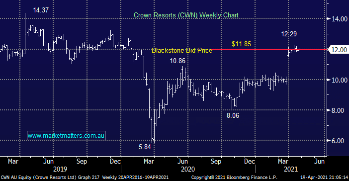 It seems Oaktree believes Crown is worth significantly more than $12 with regulatory approval and as we said a share register minus Packer it appears far more likely to get the green light. MM believes the addition of Oaktree to the mix should create a floor below the stock for the months ahead with an increased offer from a new suitor or Blackstone towards $13 a strong possibility i.e. a rare opportunity with upside but limited downside in our opinion.