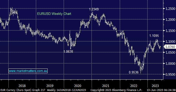 The Euro looks very similar to the $US but in reverse, while we still see further consolidation/weakness over the coming weeks the downside momentum is running out of steam – the read-through being that resources could take another leg on the downside but it’s likely to be when MM will look to increase our exposure to the area.