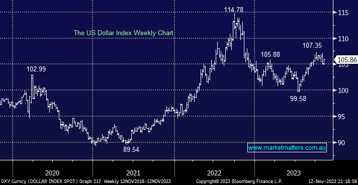 The $US edged higher last week after mixed messaging from Fed officials left markets second-guessing if the $US rally from the psychological 100 area was running out of steam; we can see more of the same, believing its short-term direction is a 50-50 call into 2024.