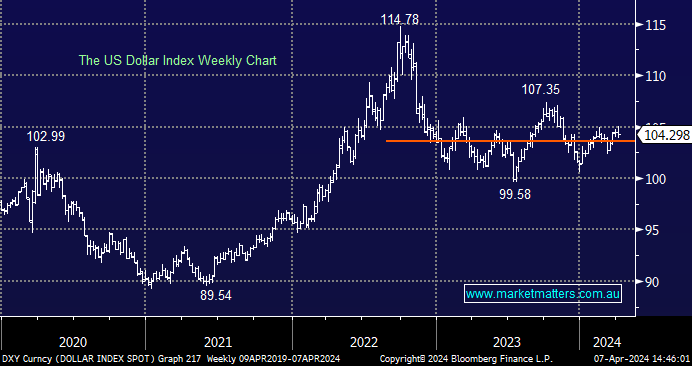 The Greenback experienced another quiet week, in line with bonds, as mixed messaging from the Fed left traders guessing about the timing of US rate cuts. The $US feels comfortable around the 104 area at this stage of the cycle, but if/when it does retest in the 100 area, it will deliver a tailwind for commodities such as oil, gold, and copper.