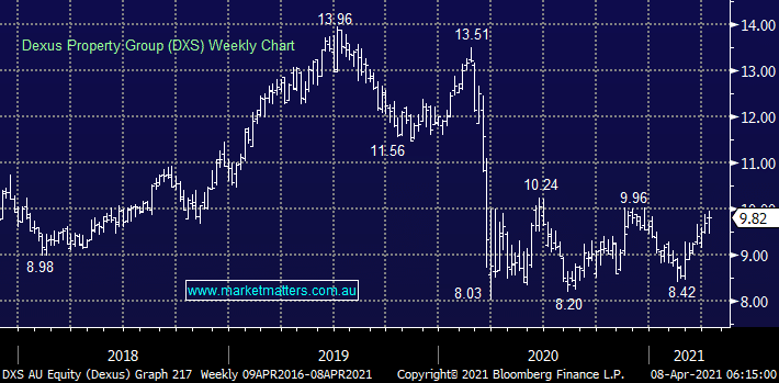 Dexus is Australia’s largest office landlord and as you can imagine suffered heavily at the hands of COVID, and to date their recovery has not been as swift as many of the other stocks in the sector. Uncertainty around what the new normal looks like in terms of demand for office space is clearly on the markets mind however this uncertainty in MM’s view is very much in the price.