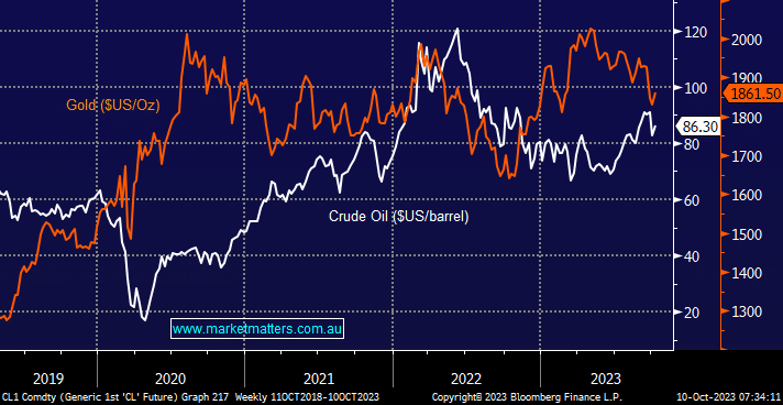- Gold has struggled over recent weeks, retracing ~$US250 as surging long-dated bond yields have taken the lustre from precious metals. We are bullish on gold into 2024, in line with our view that bond yields are set to reverse lower into 2024 weighing on the $US – our overall stance is to buy dips.