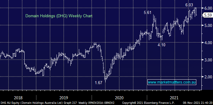 DHG is exhibiting classic “sell the pop” characteristics which has been so prevalent in 2021, after registering fresh highs in the last fortnight the stocks reversed lower as profit takers have emerged. There are no sell signals but the stock along with REA Group (REA) is not cheap after recent gains and we wouldn’t be chasing either as the RBA & APRA attempt to slow the Australian housing market.