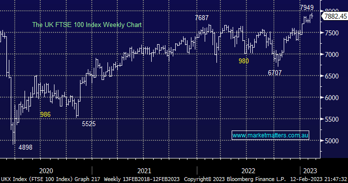 The UK FTSE again posted a new all-time high last week and while we aren’t keen on chasing the current strength there are clearly no signs of failure.