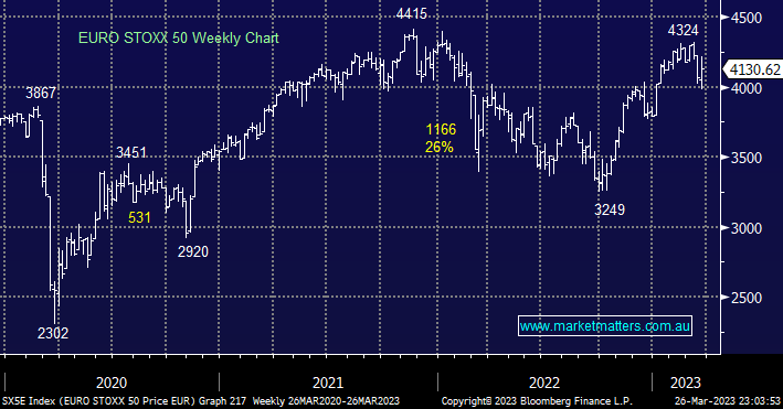 European stocks rallied last week even as banking fears remained at the front of most news stories but if Europe can follow the strong US lead from Friday we could easily see the EURO STOXX challenging its high for the year, only 4.5% away.
