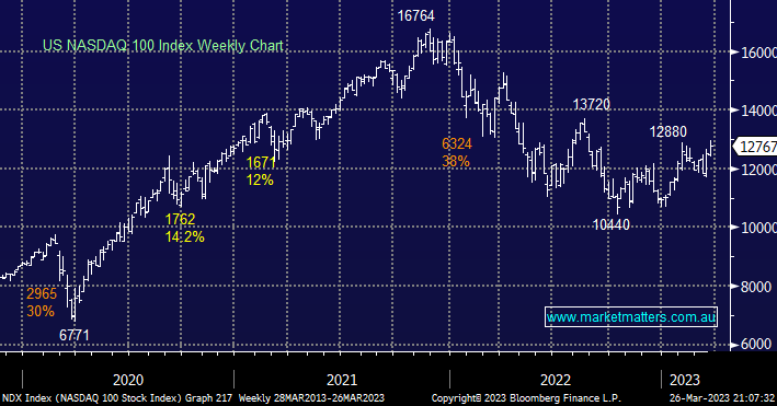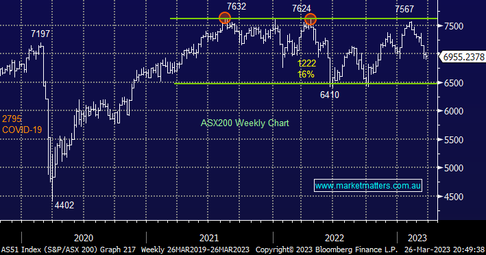 The ASX200 is down over 300 points in March having already wiped out all of the impressive gains in January and early February, investors now find themselves becoming increasingly nervous toward 2023. At the moment we have a stock market focusing on an unstable banking sector and a looming recession which by definition is weighing on the two most influential sectors in the Australian market. Medium-term we wouldn’t be surprised to see the local index remain within the confines of the last 2 years as we wait to see how well central banks can deal with the post-easy money period.